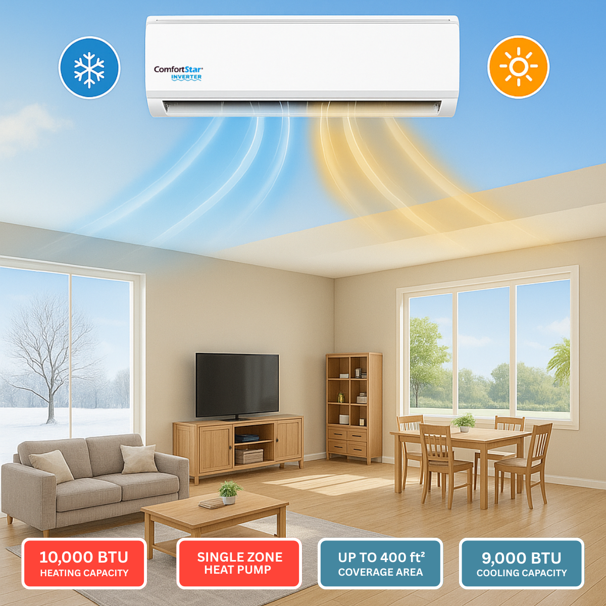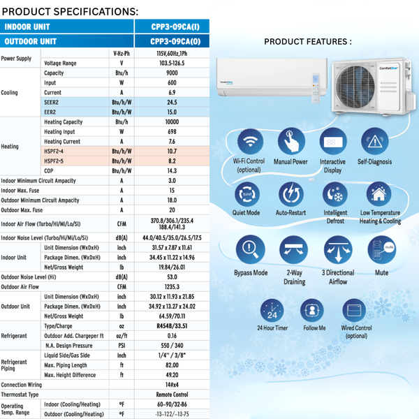 9,000 BTU Cooling + Heating - Wall Mounted Ductless Mini Split Air Conditioner Heat Pump – 23.2 SEER2 Energy-Efficient, Voltage 115V