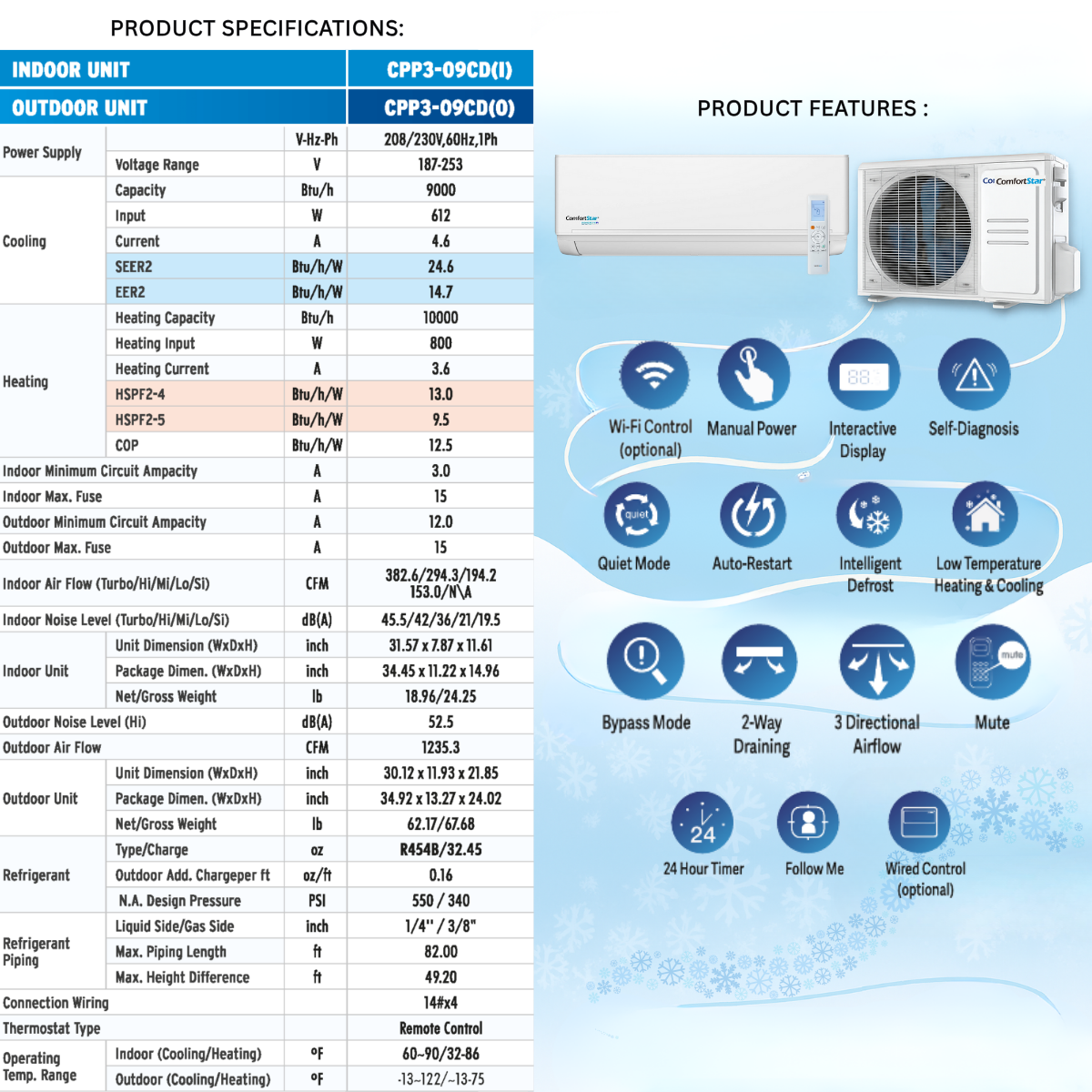 9,000 BTU Cooling + Heating - Wall Mounted Ductless Mini Split Air Conditioner Heat Pump – 24.6 SEER2 Energy-Efficient, Voltage 230V